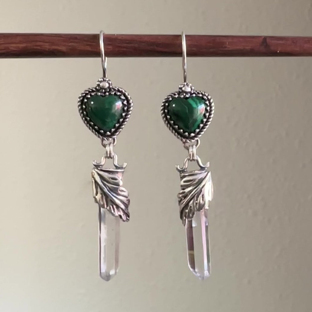 Green Malachite gemstone hearts and crystal points, adorned with floral motifs and wrapped leaves. Handcrafted entirely in sterling silver. They create little rainbows when they catch the light!